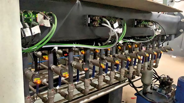 As the flow sensors of the FS+ series use the calorimetric principle to monitor liquid media, they also make it possible to continuously monitor the media temperature, in addition to monitoring the flow. Measurement and process data, as well as relevant diagnostic information, is transferred from the sensor to the controller via IO-Link. The FS+ flow sensors were installed at the inlet and outlet end of each line in order to check the performance of the cooling circuit.