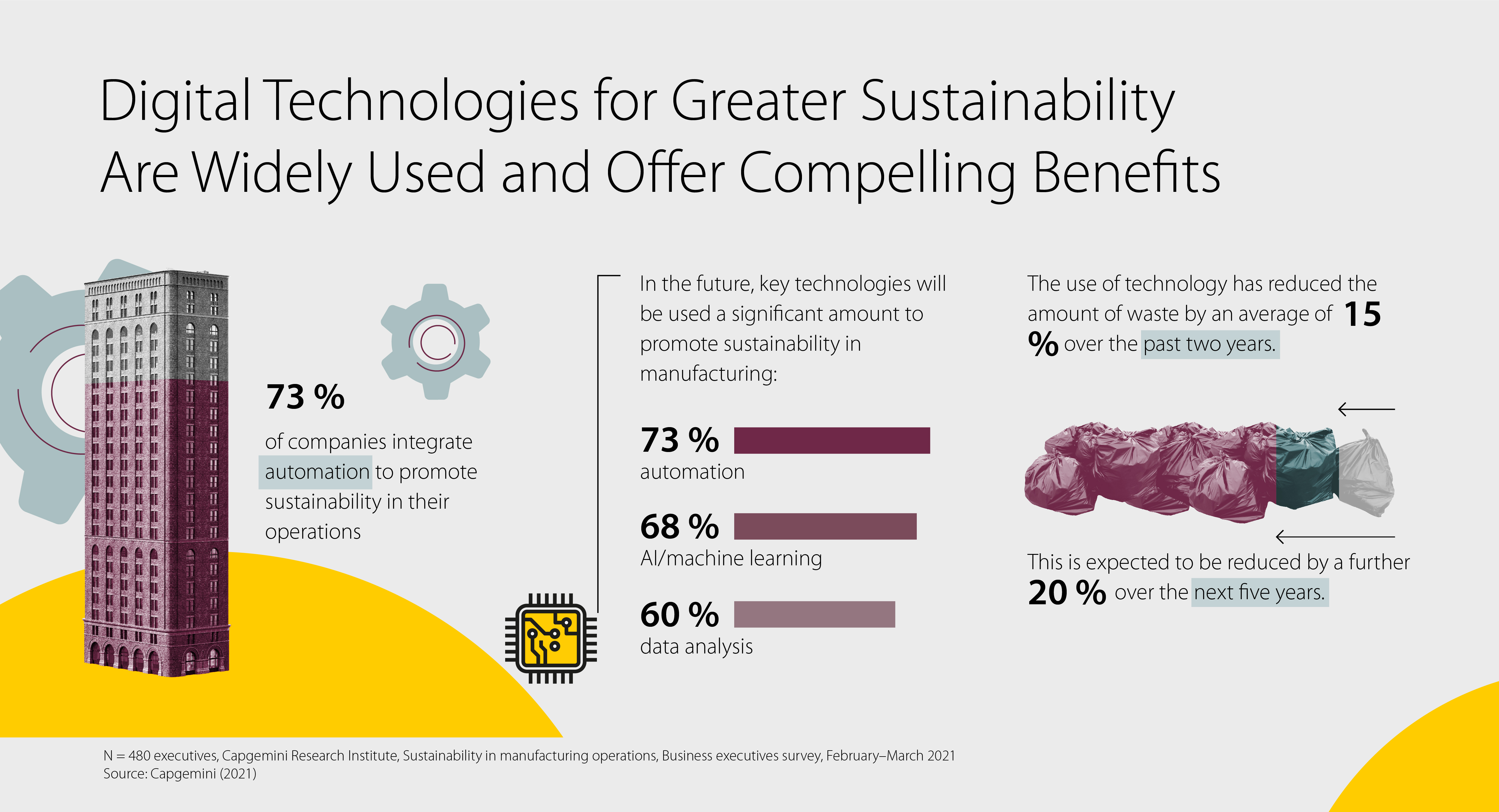 Learn how companies are using digital technologies to increase the sustainability of their production processes. Automation, artificial intelligence and data analytics are major contributors, leading to significant increases in sales and profits. To make their manufacturing processes more sustainable, industrial companies are increasingly turning to digital technologies. Automation (73%), artificial intelligence (68%) and data analytics (60%) are some of the technologies most commonly used here. The implementation of these technologies has led to a significant reduction in waste while increasing profits at the same time. Companies using digital technologies are generally seeing an improvement in their revenue and profit metrics.