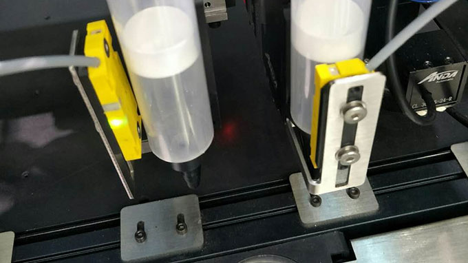 Above the dispenser needles the Dongguan-based machine builder now uses a Turck capacitive sensor with a rectangular design (BC10-QF5.5), which is only 5.5 millimeters thick and at the same time offers a
