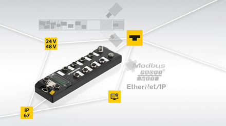 The control module supports multi-protocol Ethernet (PROFINET, Ethernet/IP, Modbus TCP) and has an integrated web interface for configuration. Four digital inputs and four configurable digital inputs/outputs enable signals to be received and transmitted directly on the line. Power is supplied via M12 L-coded connectors, optionally up to 48 V for motor supply. Thanks to its encapsulated housing and protection ratings up to IP69K, the TBEN-LLx-4SLC is suitable for use in harsh environments. The integrated ARGEE logic allows special control routines to be configured directly on the module.