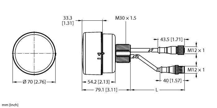 - Connection via cable with male connector, M12 × 1, 5-pin and cable and male connector, M12 × 1, 5-pin, D-coded