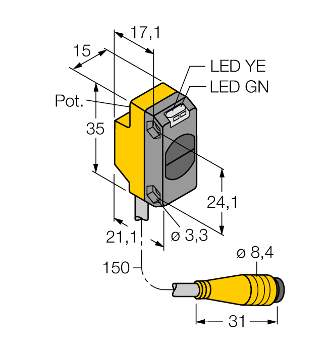 - Cable with male end, 4-pin, PVC, 150 mm, 8 mm